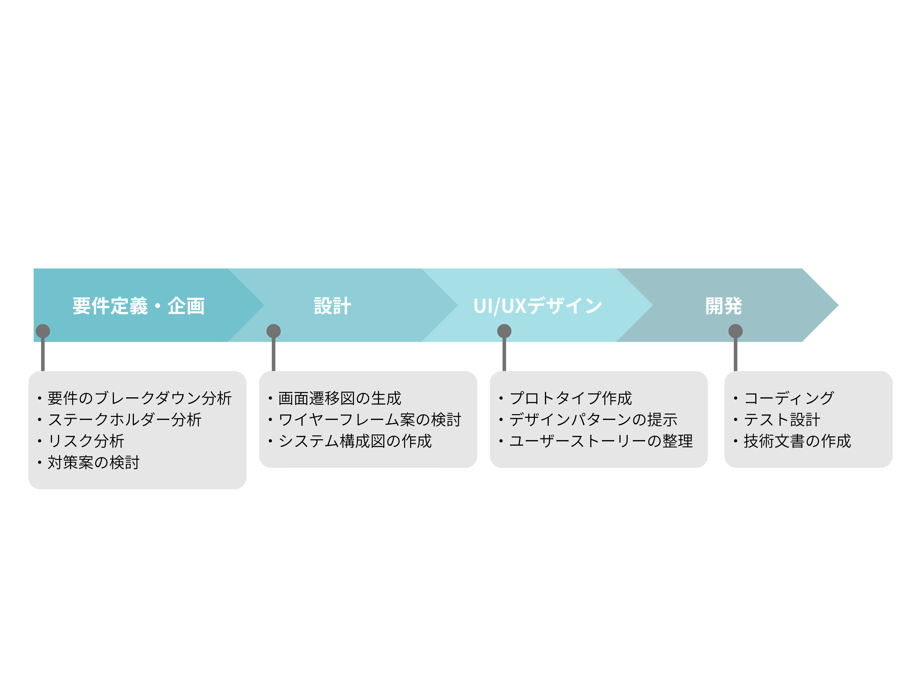 UI/UXデザインでは、プロトタイプ作成やデザインパターンの提示、ユーザーストーリーの整理を支援し、開発フェーズではコーディングやテスト設計、技術文書の作成をサポートします。