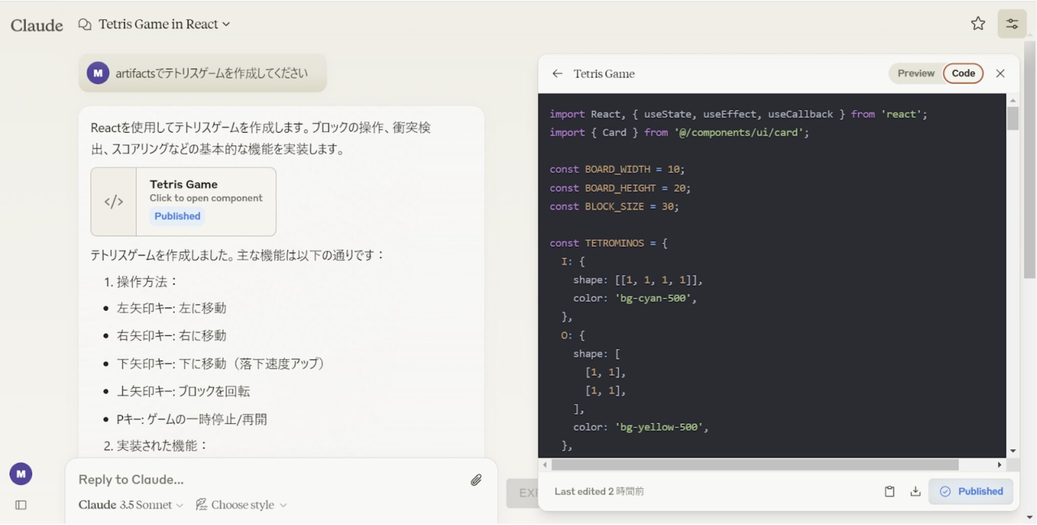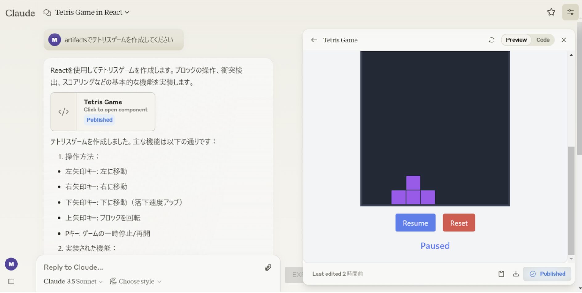 例えば「artifactsでテトリスゲームを作成してください」と伝えるだけでコードが生成されていき、完成すると実際にブラウザで遊ぶことができます。